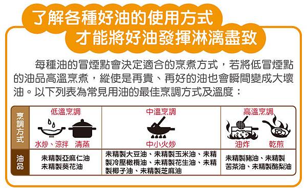 火炒、中溫烹調 : (非精製)橄欖油、椰子油、芝麻油